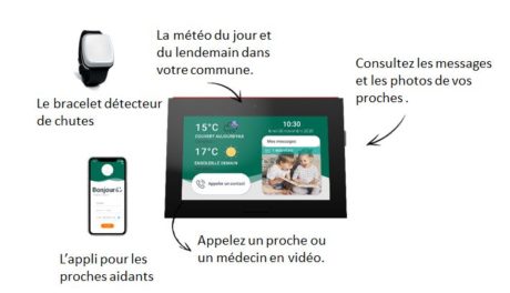- Une tablette , incluant des services d’appels et de vidéos, l’accès à la téléconsultation, des services à la personne et appels de convivialité